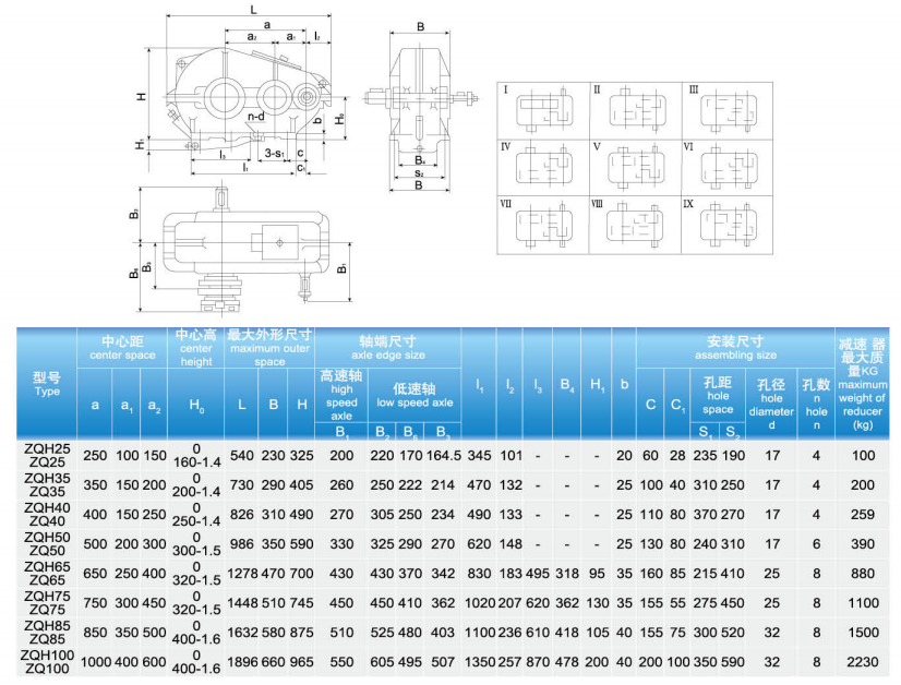產(chǎn)品型號:ZQ250、ZQ350、ZQ400、ZQ500、ZQ650、ZQ750、ZQ850、ZQ1000。公稱傳動比:8、10、12.5、16、20、25、31.5、40、50。ZQ圓柱齒輪減速機外形尺寸: